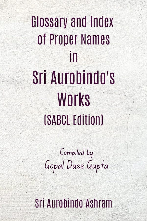 In this "Glossary and Index" are listed proper names - personal, geographical, historical, fictional, mythological, etc. - used by Sri Aurobindo in his writings. The volumes referred to are the twenty-nine text volumes of the Sri Aurobindo Birth Centenary Library and Volumes 1 to 11 <1977 to 1987) of the semiannual journal Sri Aurobindo: Archives and Research. (For the purpose of the Glossary the scope is extended to include the unpublished portion of Sri Aurobindo's "Record of Yoga", which will continue to be published in future issues of the journal.) To collect the names all of the texts in each of these volumes have been carefully perused. Names occurring in footnotes and introductory notes, whether written by the author or added by the editors, have also been included.