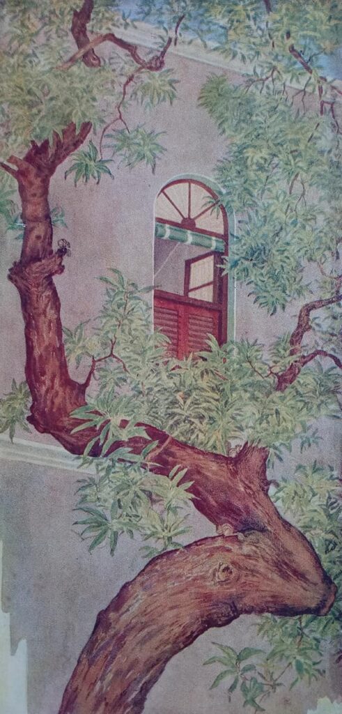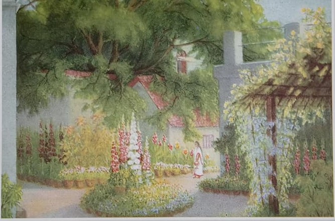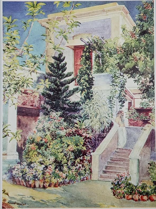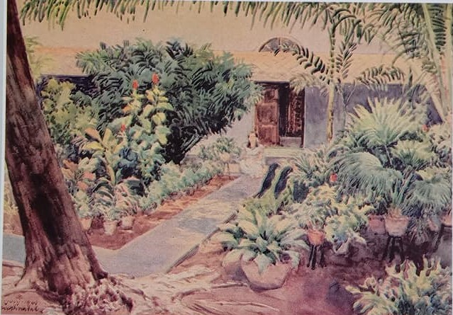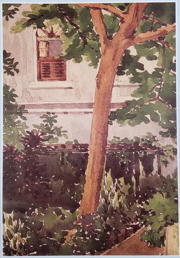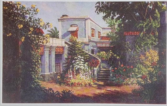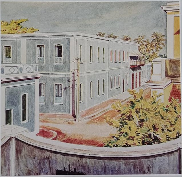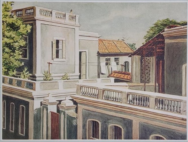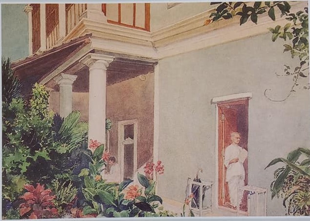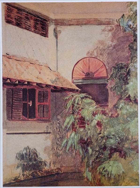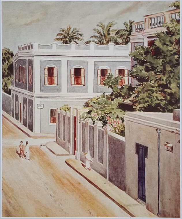 North-east corner of the Ashram main building with the Mother's balcony at right