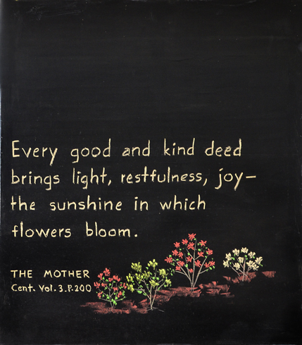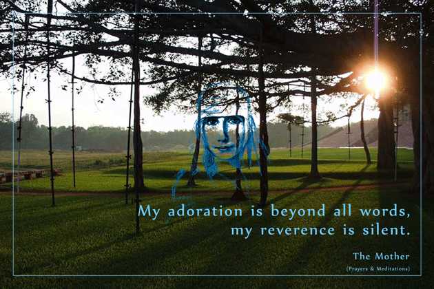 The first word represents: the supreme invocation the invocation to the Supreme. The second word represents: total self-giving; perfect surrender. The third word represents: the aspiration, what the manifestation must become—Divine.