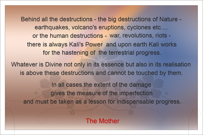Aspired the harmony of her puissant voice: “O Savitri, I am thy secret soul.... ||123.9|| I am Durga, goddess of the proud and strong, And Lakshmi, queen of the fair and fortunate; I wear the face of Kali when I kill, I trample the corpses of the demon hordes.... ||123.16|| I shall hear the silver swing of heaven’s gates When God comes out to meet the soul of the world.” ||123.27||