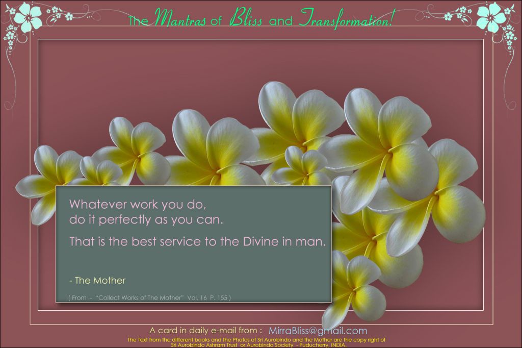 And is it not Thou greeting Thy own self in the Unthinkable Essence of Being, in its immeasurable depths, and even in its most external realisations? For the Being is Thyself, whatever its mode of existence, and the Unthinkable Eternal is also Thyself in Thy essence. And this integral consciousness Thou hast made ours, so that we may be Thyself, not only in fact but consciously and effectively. And thus all is an interchange of salutations full of love and joyous adoration, in an ardent aspiration of our Mother towards Thee and an infinite and powerful response from Thee to our Mother, and finally from the totality of Thyself to all that is not yet manifested, to all the Unknowable which we shall know more and more, better and better, but which will ever remain the Unknowable.
