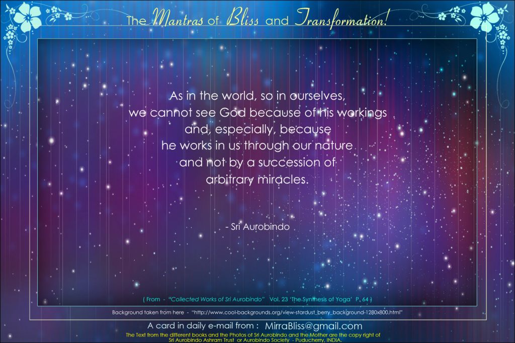 O Lord, Thou showerest upon me all Thy boons. Now that this being expects nothing, desires nothing from life any longer, life brings it its most precious treasures, those coveted by all men. In all the domains of my individual being Thou showerest Thy boons, in the mind, the psychic and even the physical. Thou hast placed me amidst abundance, and abundance seems to me as natural as scarcity and does not bring me a greater joy, for often in poverty the spiritual life was more intense and conscious for me; but I see this abundance very clearly, and my individual being on whom Thou heapest Thy boons thus, prostrates itself before Thee in inexpressible gratitude.