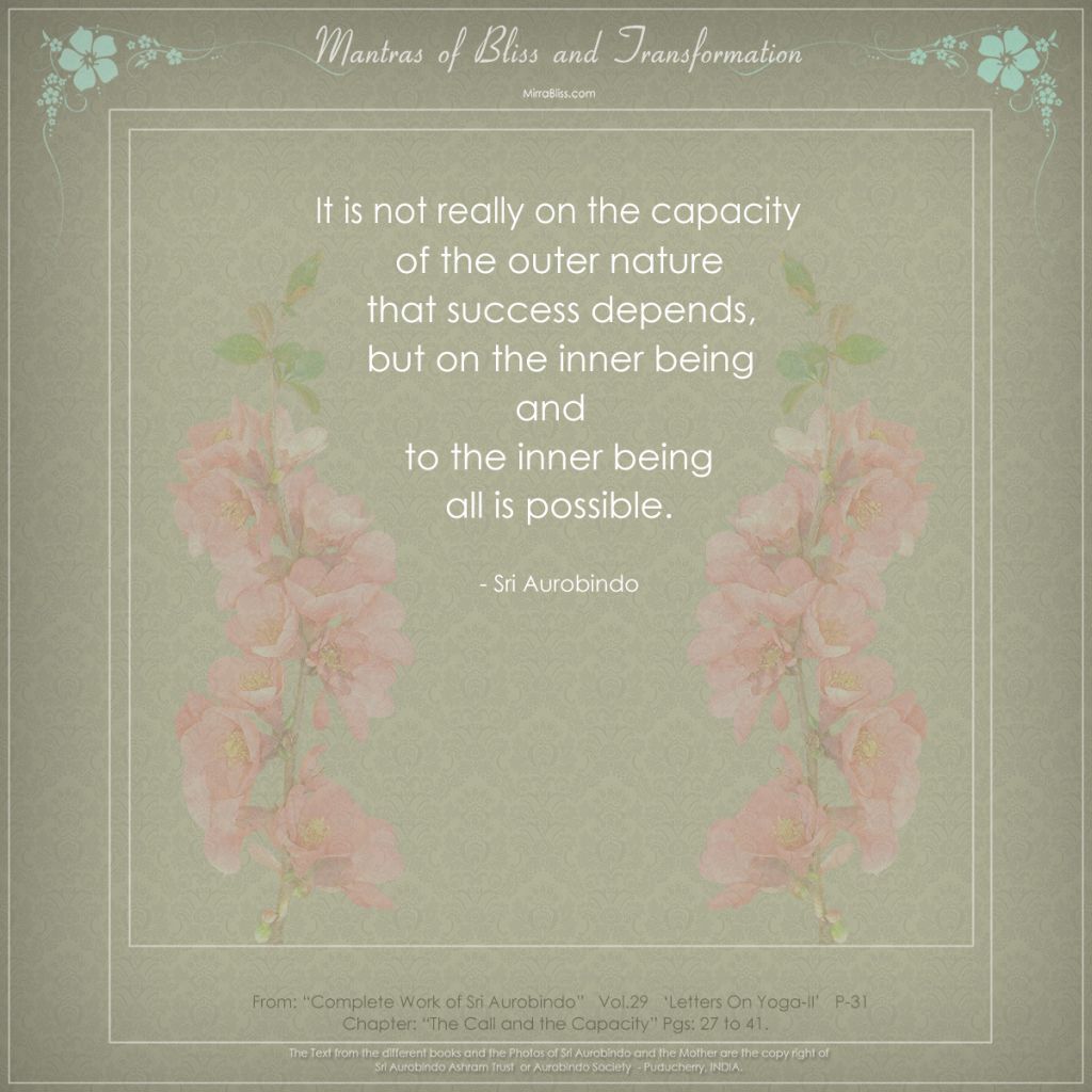 Everything is contained potentially. Each element of a whole potentially contains what is in the whole. It is a little difficult to explain, but you will understand with an example: when people want to practise magic, if they have a bit of nail or hair, it is enough for them, because within this, potentially, there is all that is in the being itself. And in a book there is potentially - not expressed, not manifest - the knowledge which is in the person who wrote the book. Thus, Sri Aurobindo represented a totality of comprehension and knowledge and power; and every one of his books is at once a symbol and a representation. Every one of his books contains symbolically, potentially, what is in him. Therefore, if you concentrate on the book, you can, through the book, go back to the source. And even, by passing through the book, you will be able to receive much more than what is just in the book.