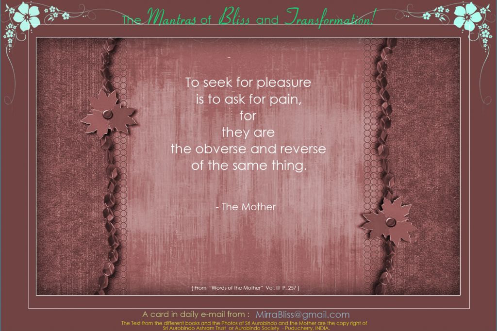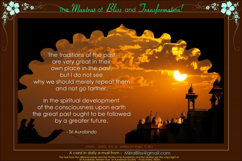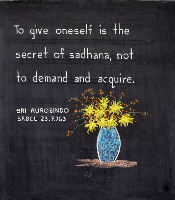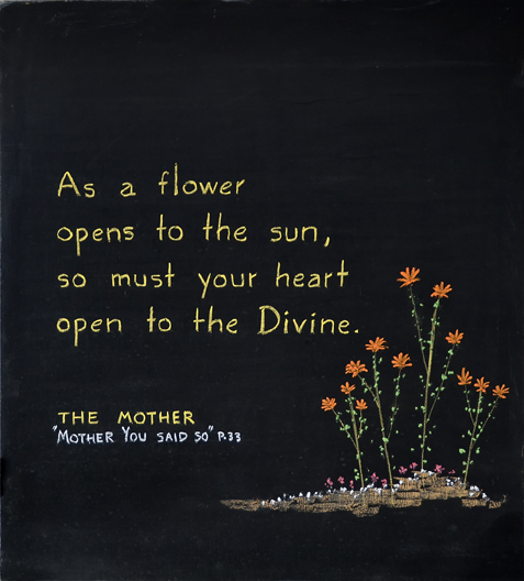 The first word represents: the supreme invocation the invocation to the Supreme. The second word represents: total self-giving; perfect surrender. The third word represents: the aspiration, what the manifestation must become—Divine.