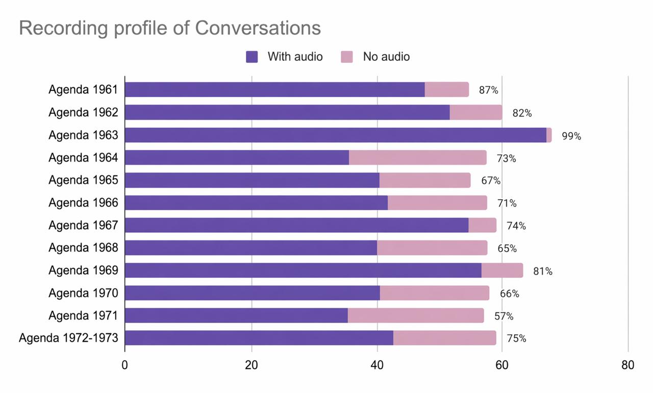 Audio recordings for ~75% of the long conversations (more than 2 pages) are available. Please refer to the following graph for a year-wise breakup.