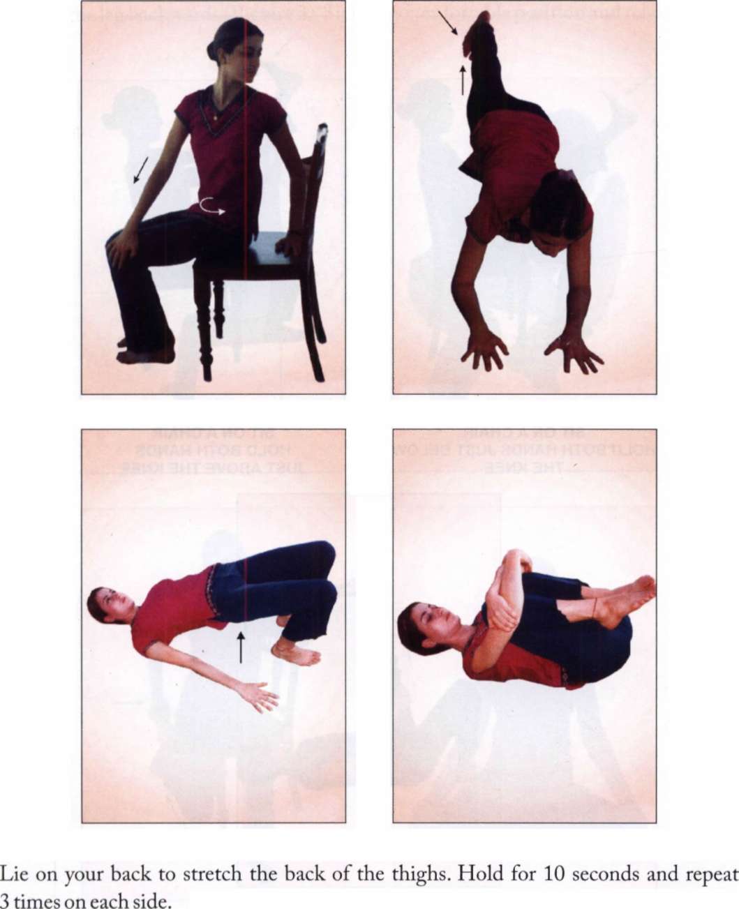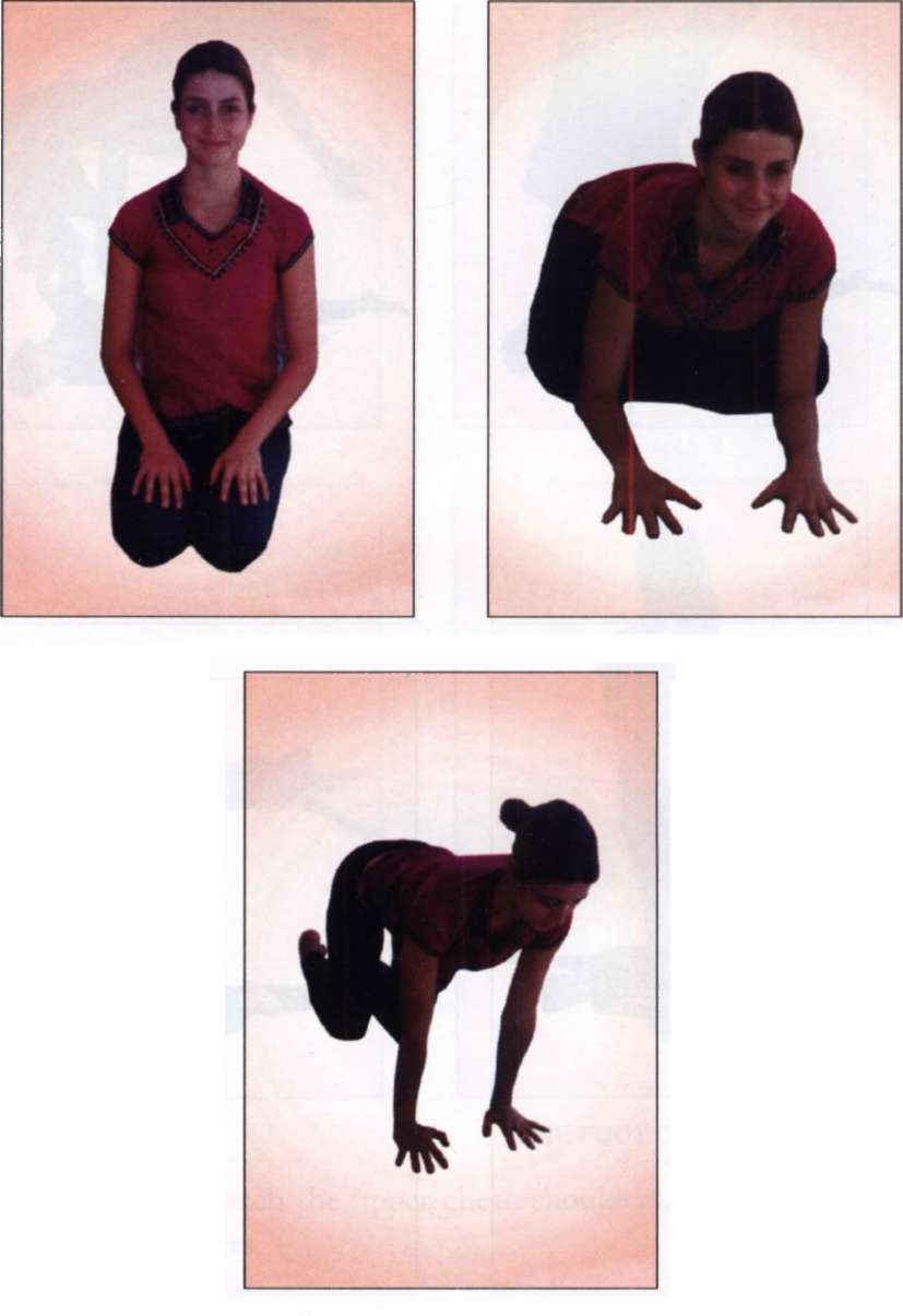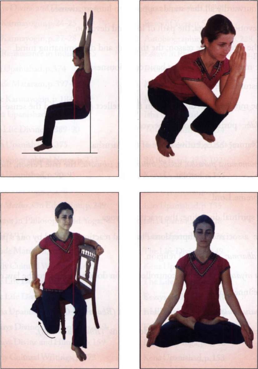 Half-sit against a wall. Hold for 30 seconds to strengthen the knees (Picture 1). Three-fourth sit: join both hands and hold the position for 30 seconds (Picture 2). Do not attempt in case of knee ailment. Sitting across on a chair, hold your foot and pull the leg backwards (Picture 3). Sit in any comfortable position and relax.