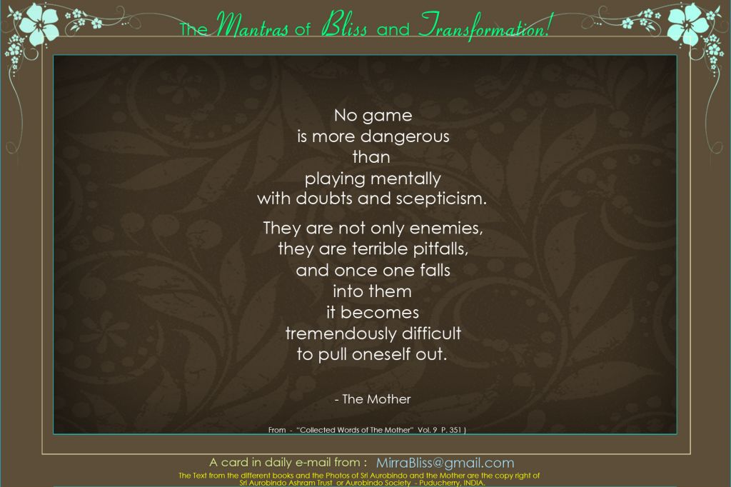 OM Sri Aurobindo Mira Open my mind, my heart, my life to your Light, your Love, your Power. In all things may I see the Divine