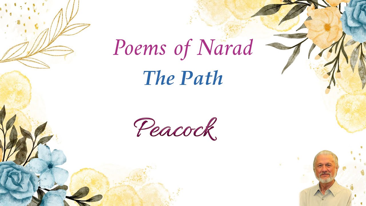 The peacock calls and his voice resounds Moving his head in forward jerking starts Going about his planned diurnal rounds Moving steadily down from a tree departs