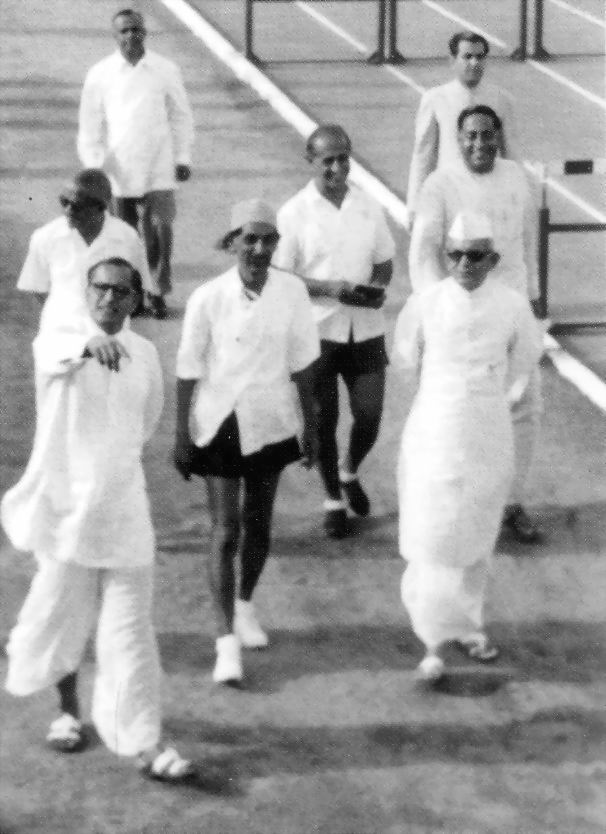 (R to L) K. M. Munshi, Nolini Kanta Gupta, Madhav Pandit at the Ashram Sports ground